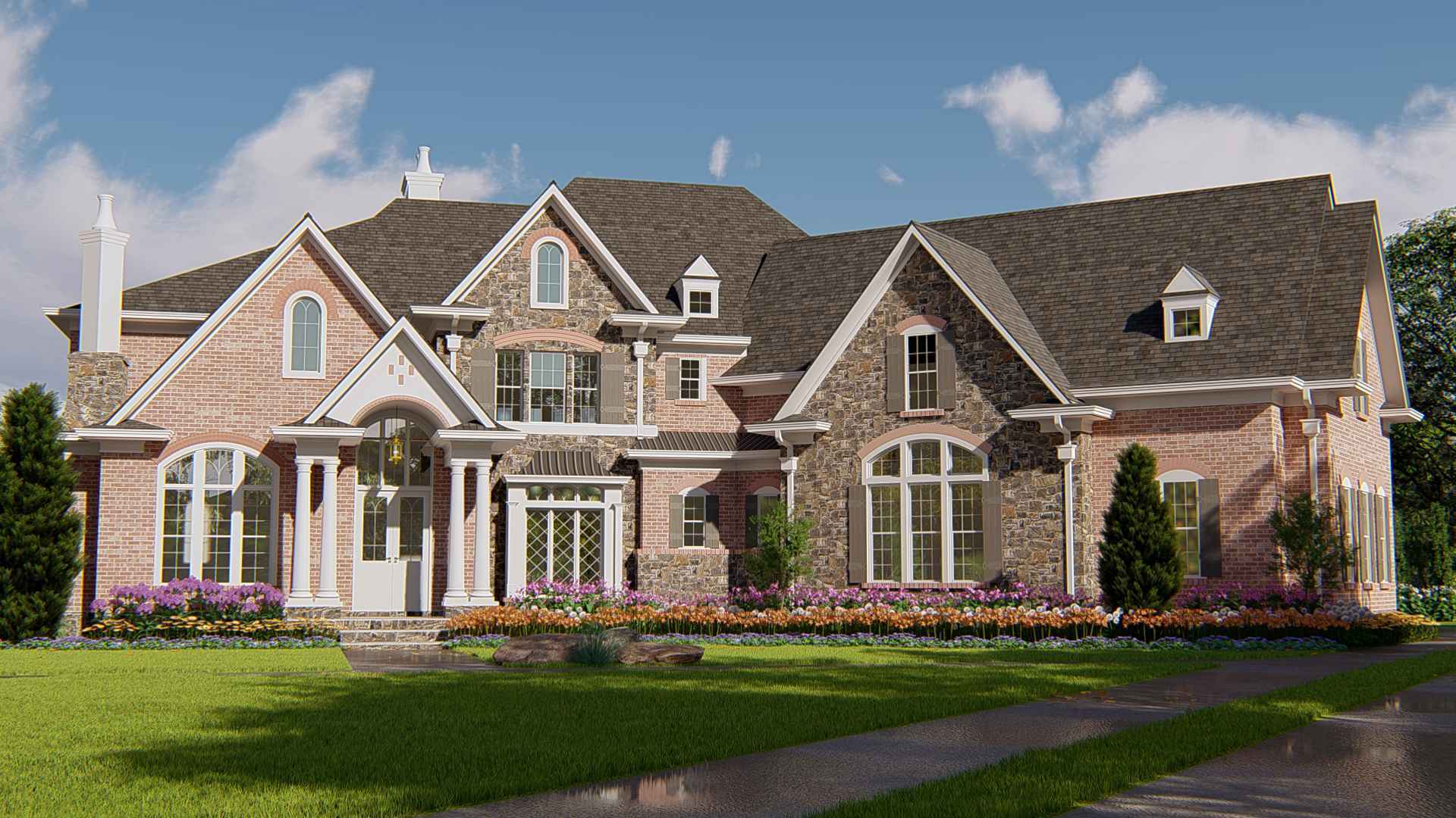 This European manor house plan features exquisite exterior details, open spaces, and luxurious living at its finest. When you enter this French Country home plan you first notice the natural light entering through the two-story foyer and grand room. The two-story grand room features a wall of windows, fireplace, and built-in cabinets. The large kitchen is perfect for entertaining with an island, bar area, and ample amount of counter space. Adjacent to the kitchen are the breakfast room and family room. An outdoor porch sits off the family room and houses a fireplace and barbeque. The spacious master suite includes a sitting area with fireplace, master bath with his and hers sinks, and a considerable walk-in closet. There are two sets of stairs leading to the second floor. One is located in the living room while the other is a decorative curved staircase featured in the foyer area. The second floor includes three additional bedrooms each with their own full bath. Also an optional bonus room is included. We offer floor plan modifications on all of our European manor house plans.
