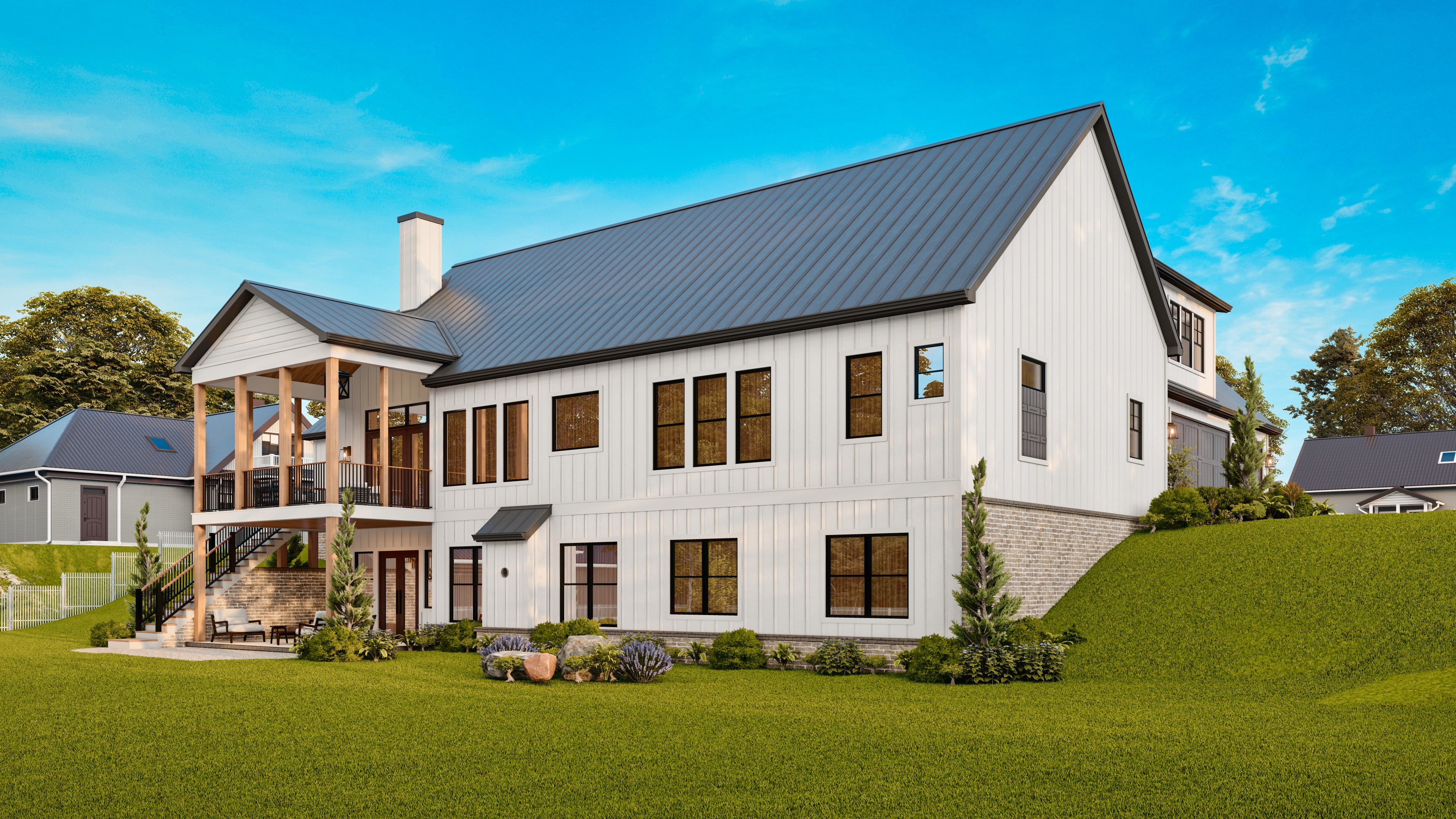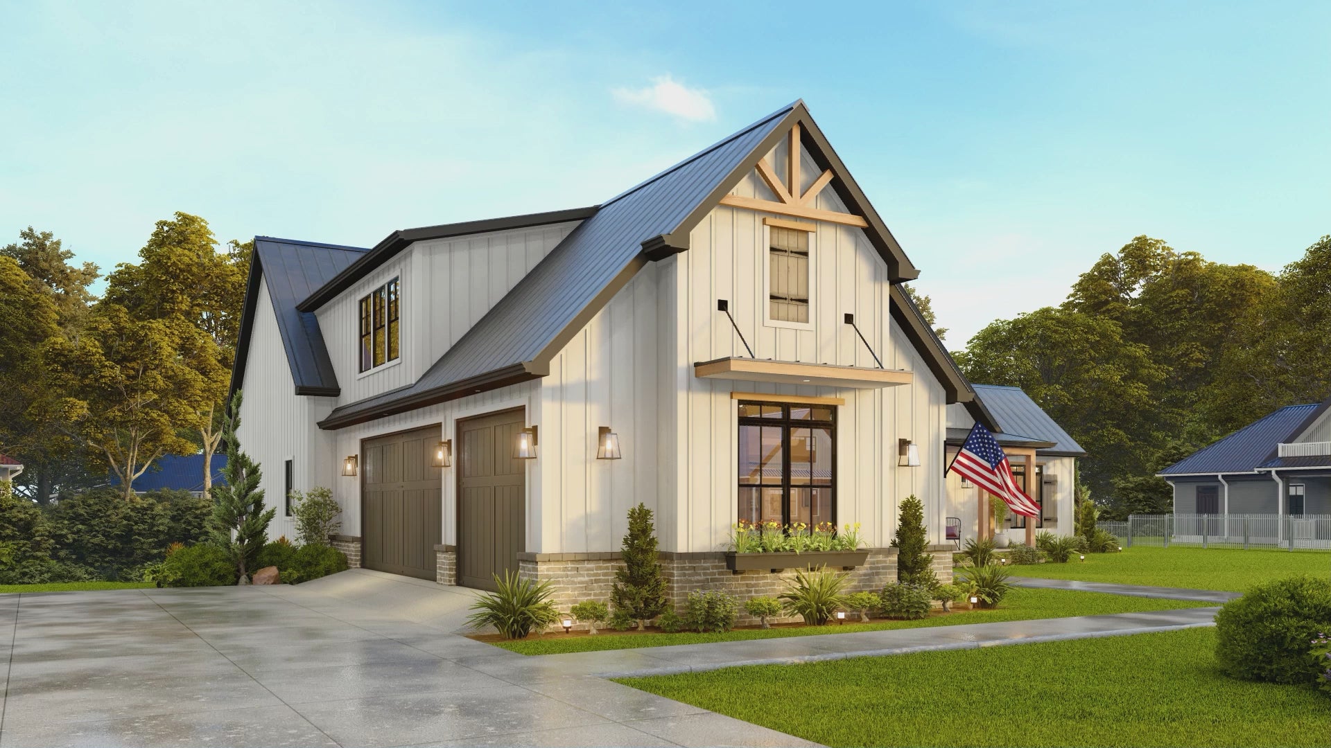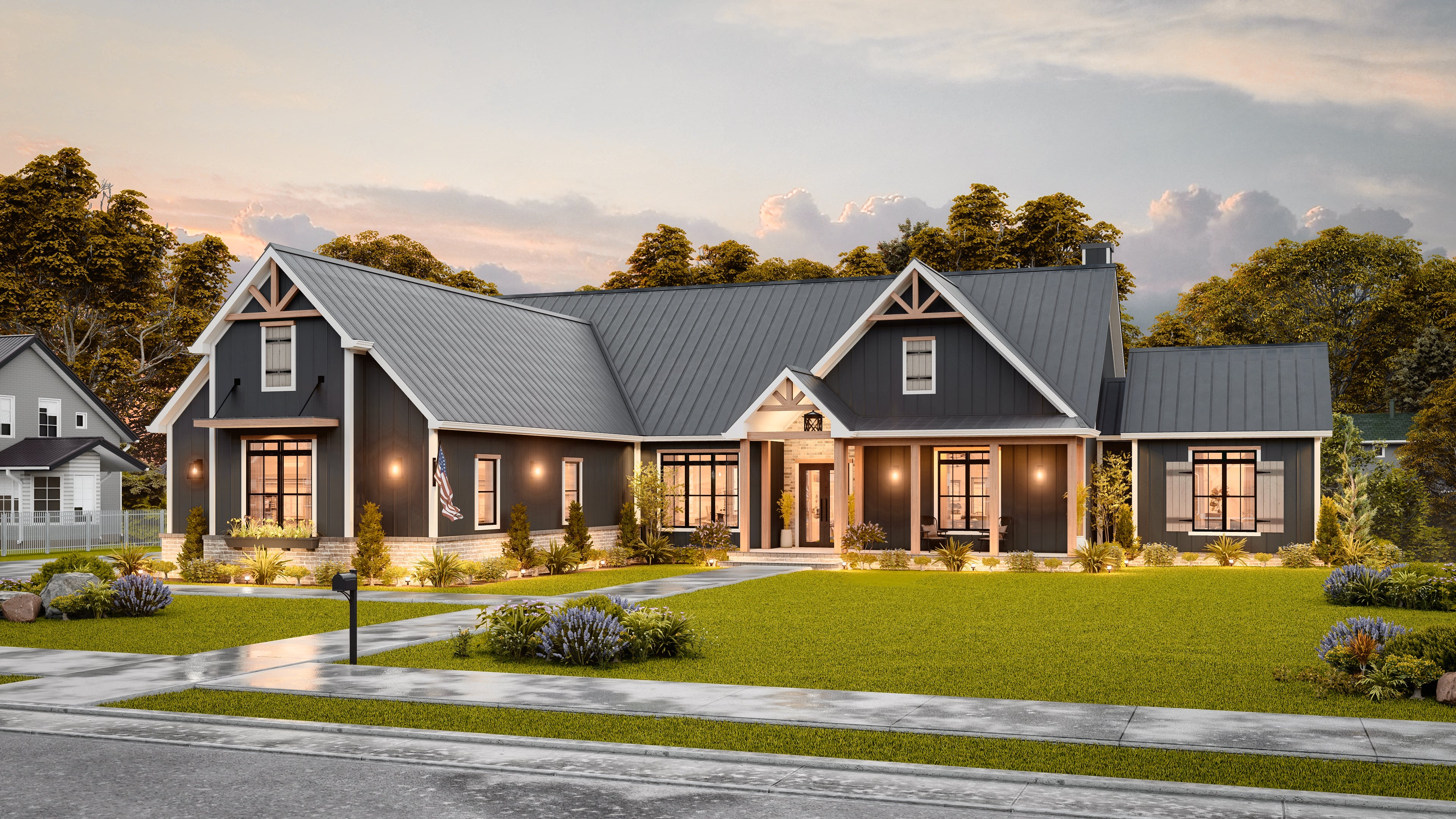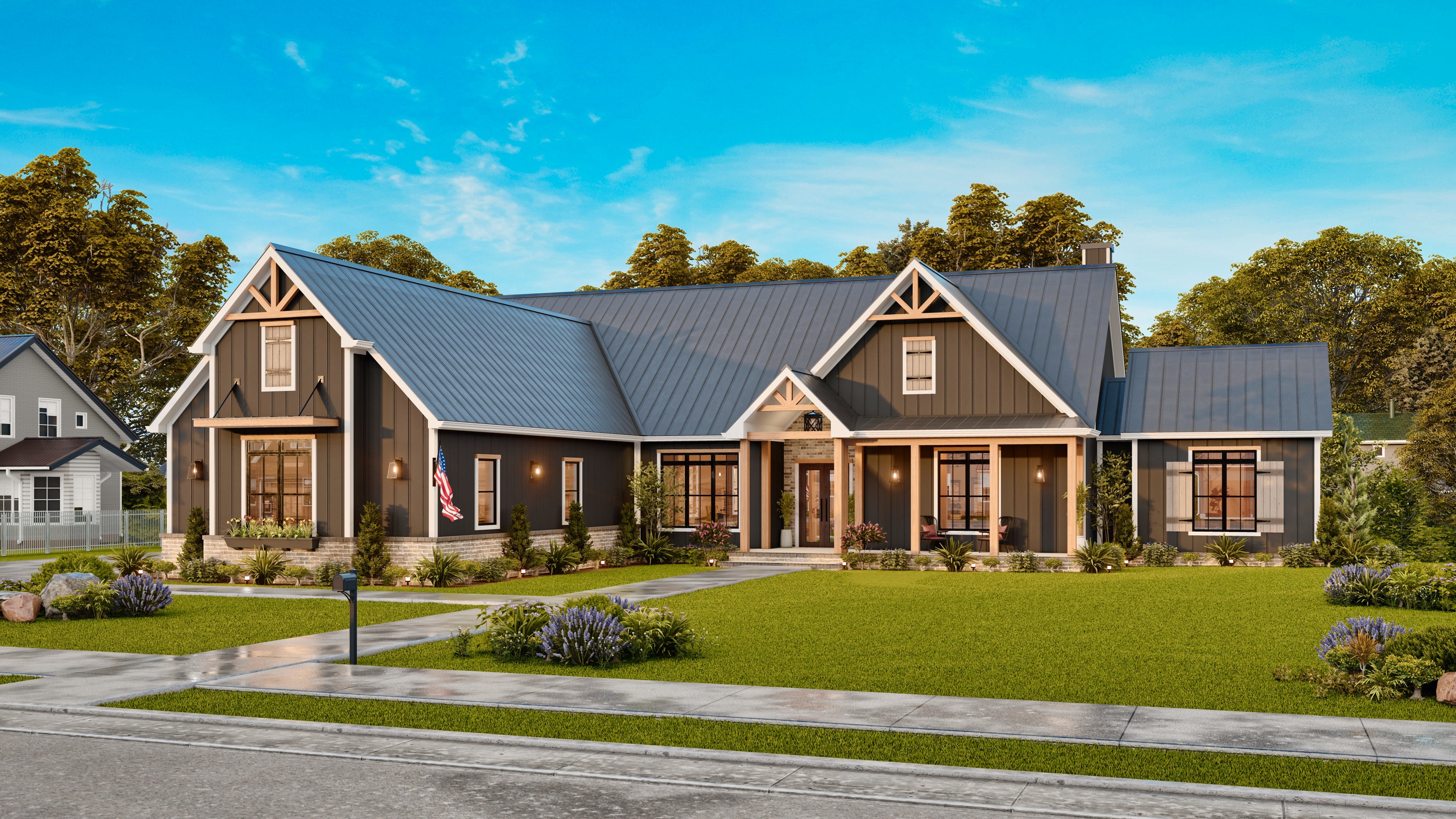The Blossom Hill House Plan showcases a beautifully designed Modern Farmhouse home. The house features a whiteboard-and-batten exterior, contrasted with dark metal roofing and window frames, which give it a clean and contemporary look. Wooden accents, such as exposed beams in the gables and a wooden front door, add warmth and texture to the overall design.