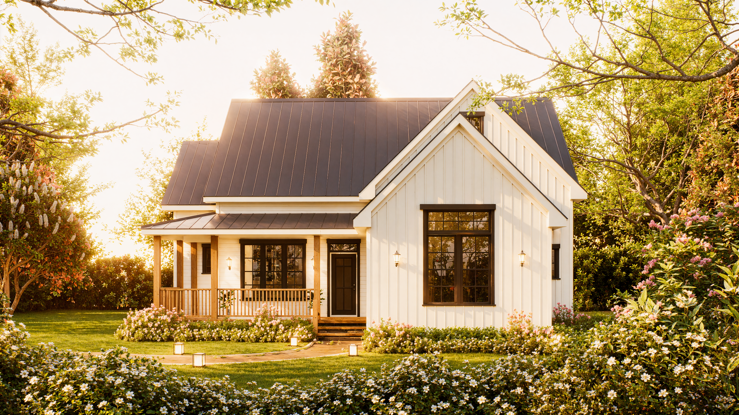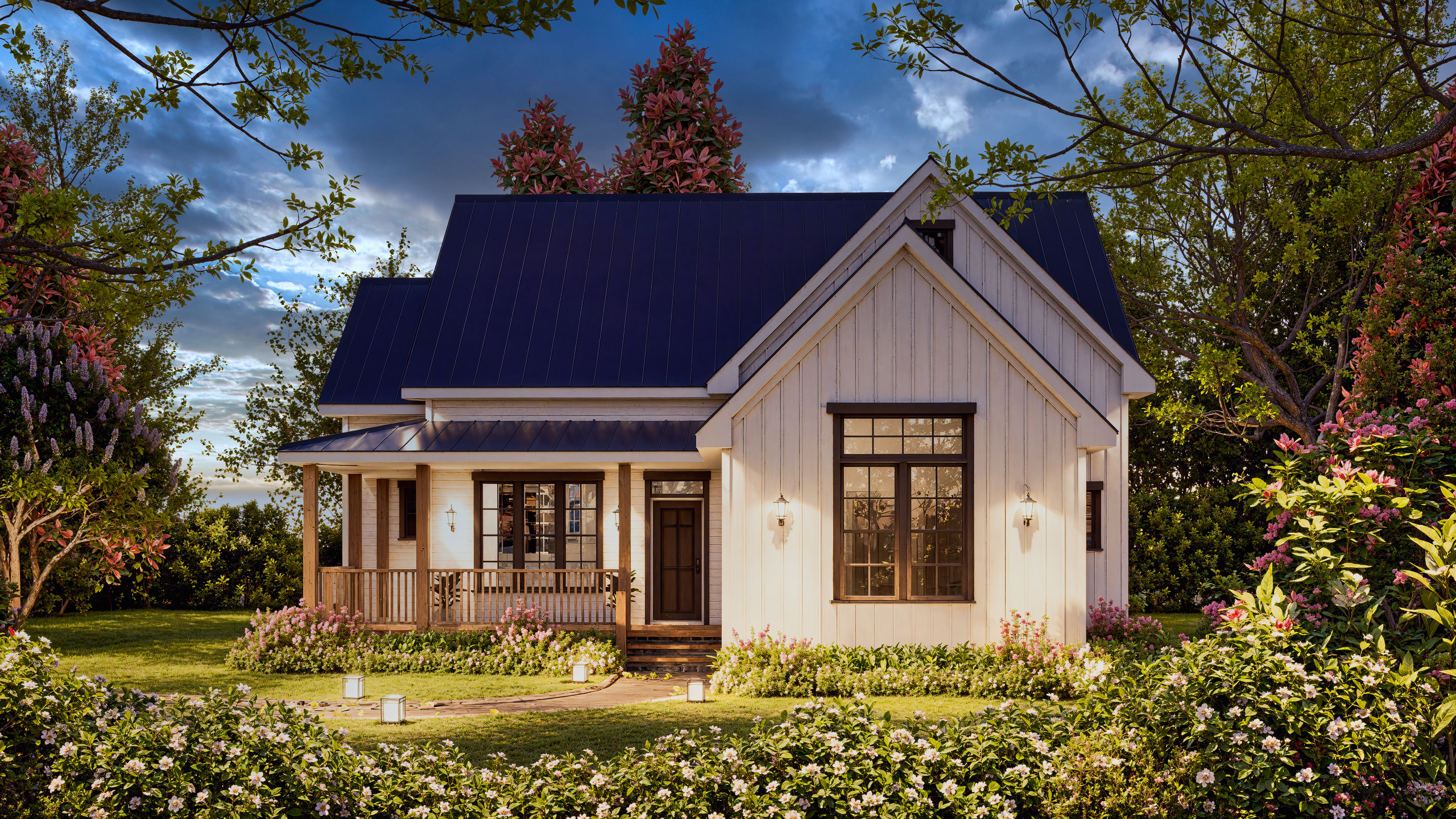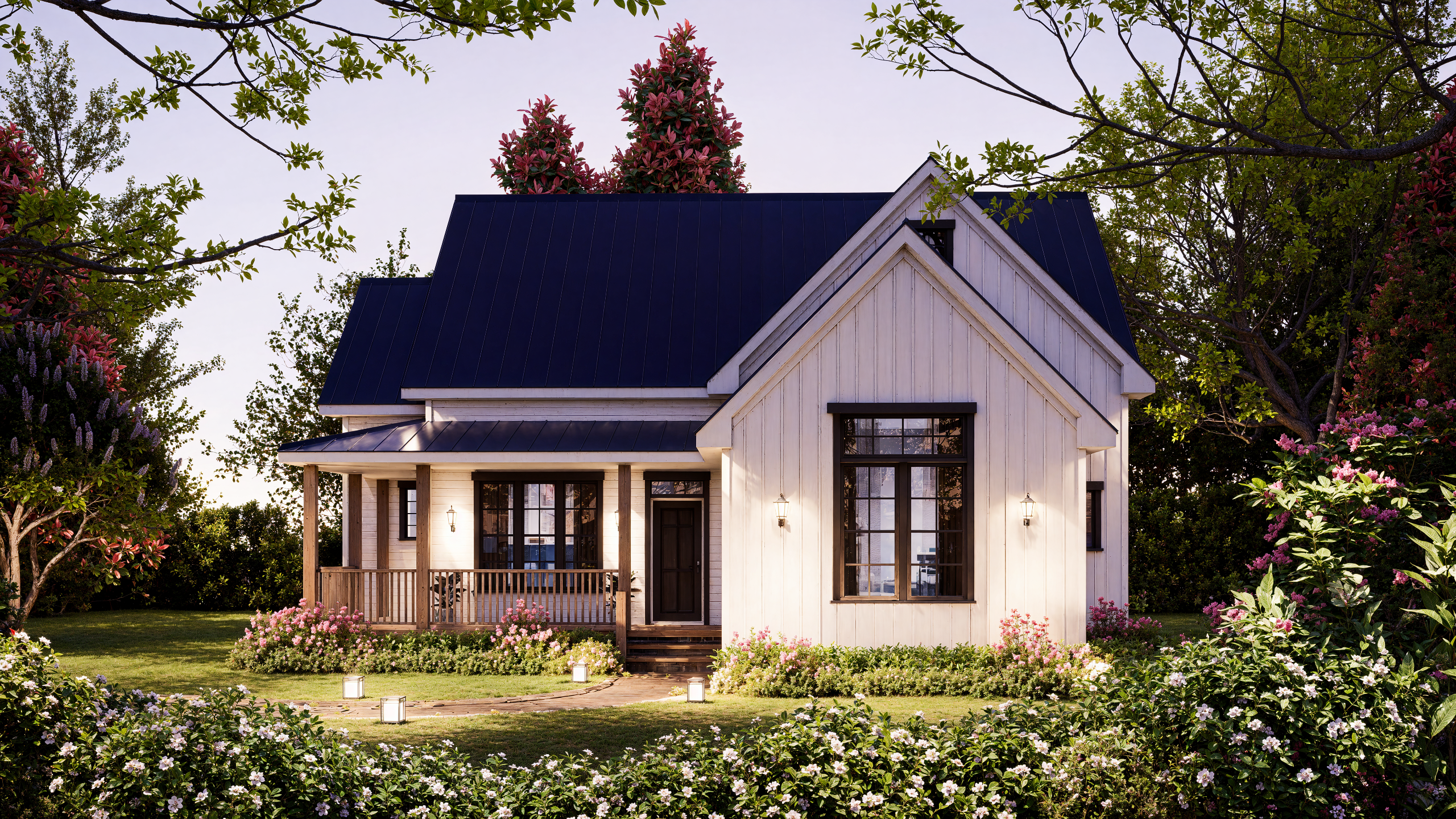 Designed for indoor-outdoor living, the home includes a welcoming 169 sq ft front porch, a 210 sq ft deck, and a covered rear porch that extends your living space outdoors. With clean board and batten siding, a durable metal roof (12:12 pitch), and no garage, this plan is ideal for narrow lots or as a vacation home, ADU, or downsized forever home. Functional, flexible, and full of farmhouse flair—this design offers everything you need, and nothing you don’t.