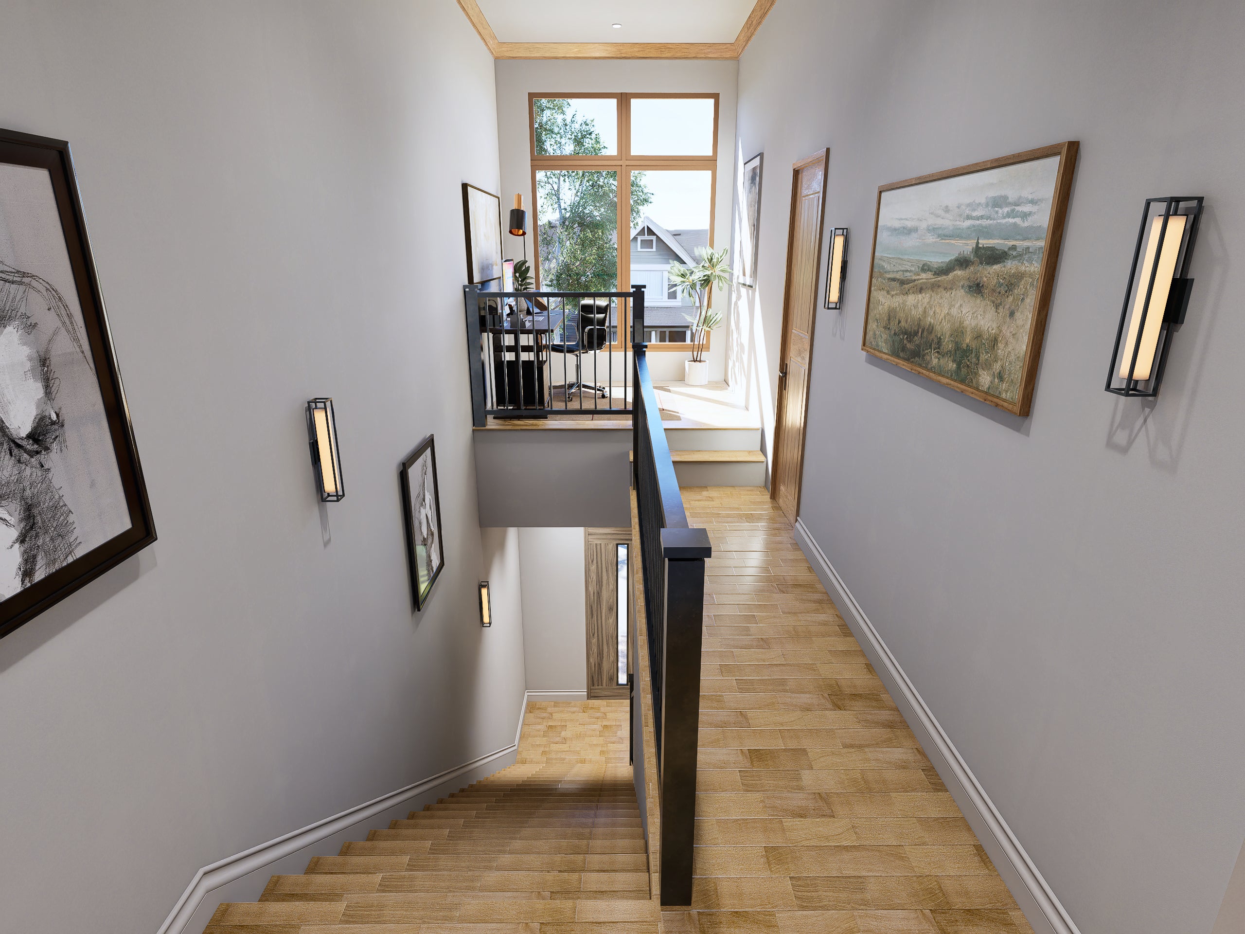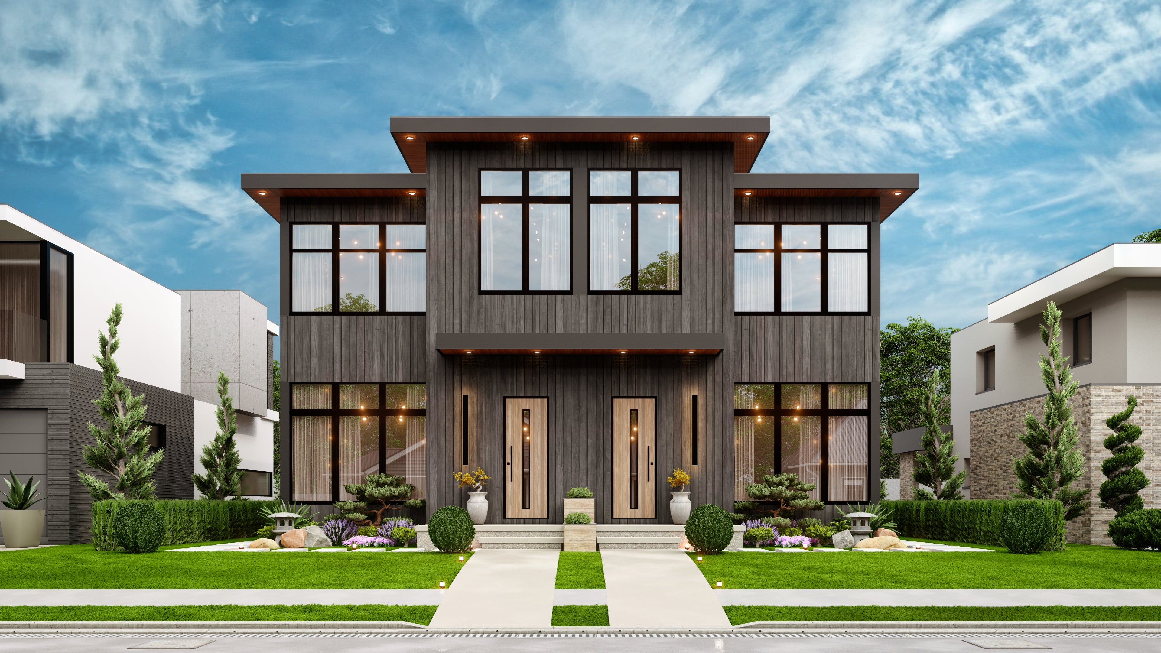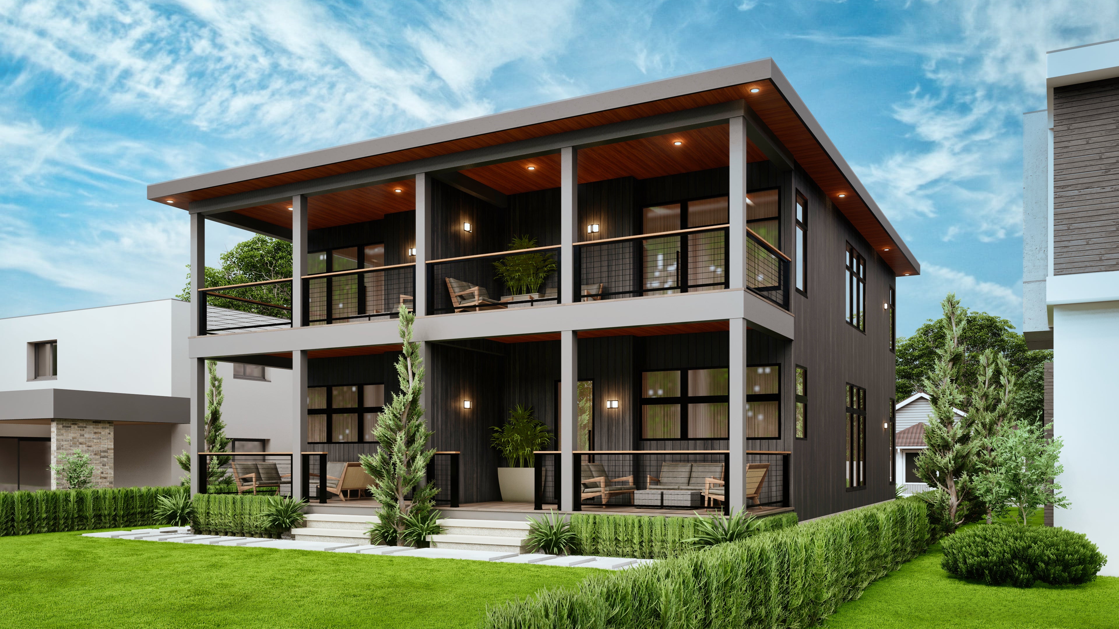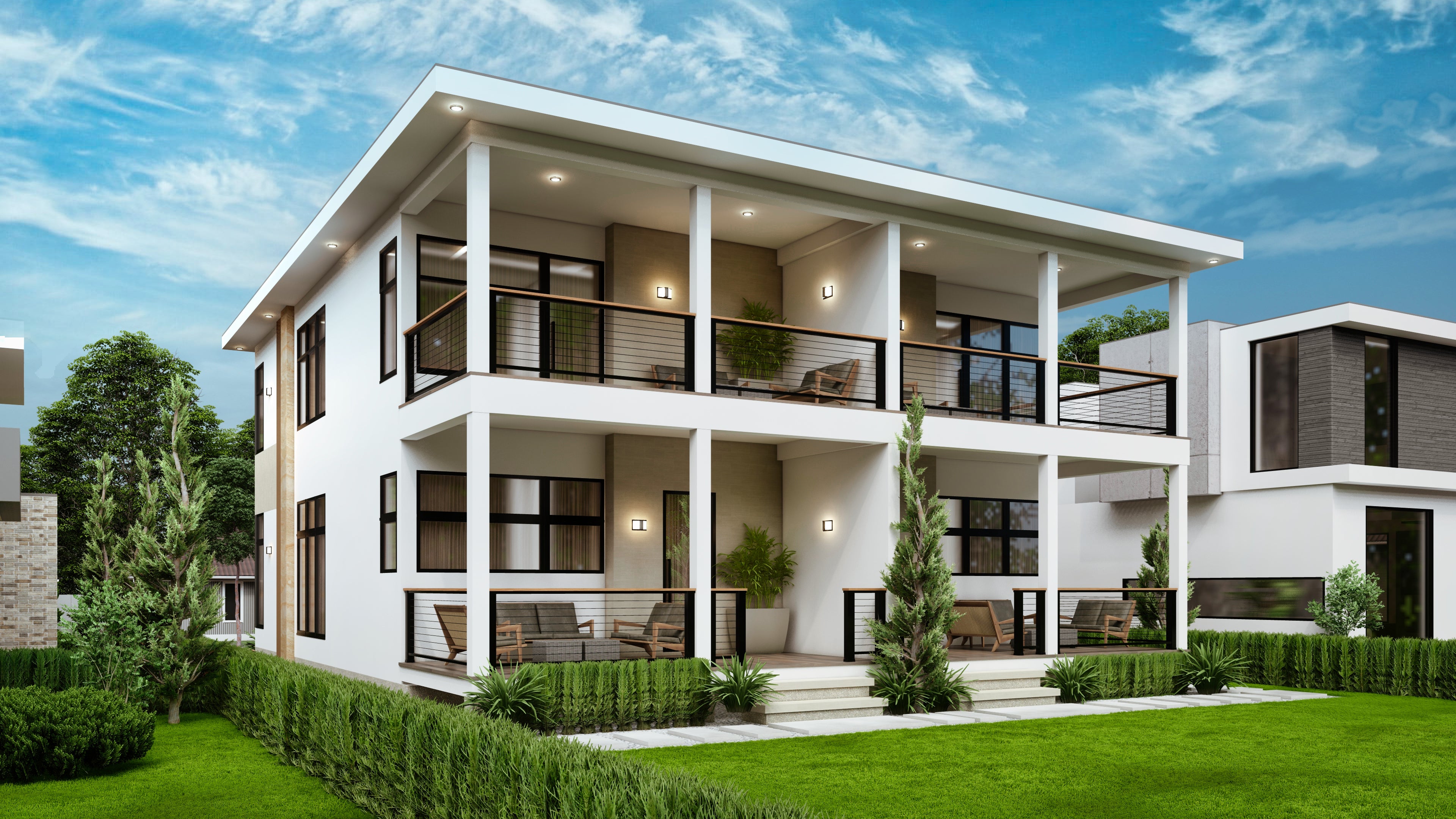 Upstairs, the 9-foot ceilings create a comfortable, airy feel across all bedrooms. The master suite features a walk-in closet and access to a private balcony, offering a relaxing retreat. Each unit is enhanced by thoughtful features like a Jack and Jill bathroom, upstairs laundry, and no shared interior walls, ensuring both privacy and functionality. Exterior highlights include vertical siding, flat rooflines, durable PVC/TPO roofing, and 2x6 exterior wall framing. With a total building width of 42'-4" and depth of 57'-0", this duplex plan is an ideal fit for narrow lots, rental investments, or owner-occupant properties.
