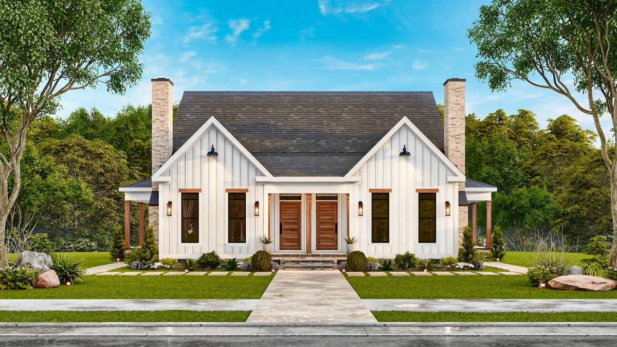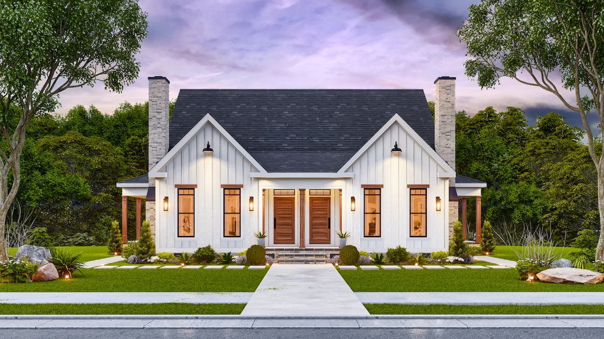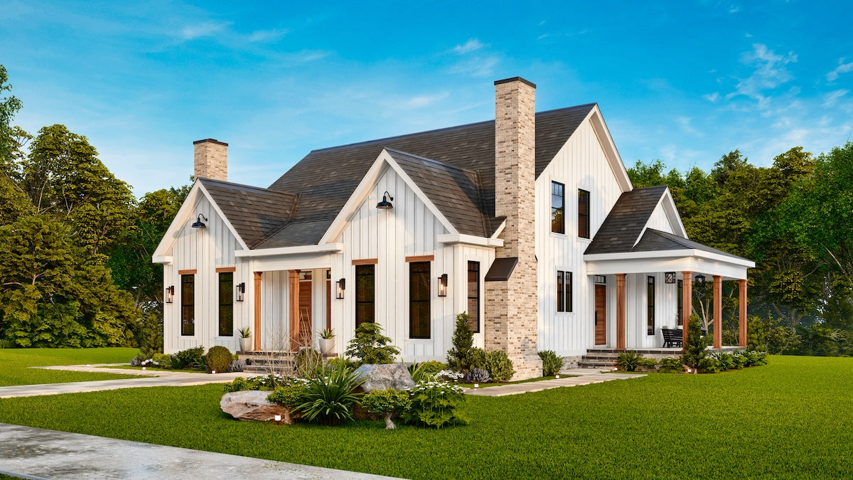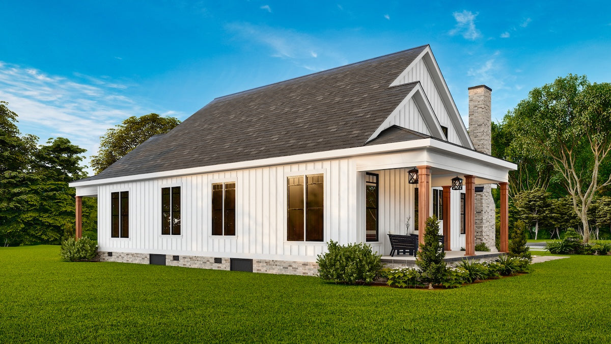 The exterior showcases charming architectural details, including a covered front porch and an inviting side porch, ideal for outdoor relaxation and socializing. The house features a 9:12 roof pitch with stick roof framing and durable 2x4 wall framing. Both units benefit from walk-in closets, providing ample storage and organization. A cozy fireplace adds a touch of warmth and elegance to the living areas. Set on a crawl space foundation, this duplex design combines practicality, comfort, and modern amenities, making it an excellent choice for families or investors looking for a versatile multifamily living solution.