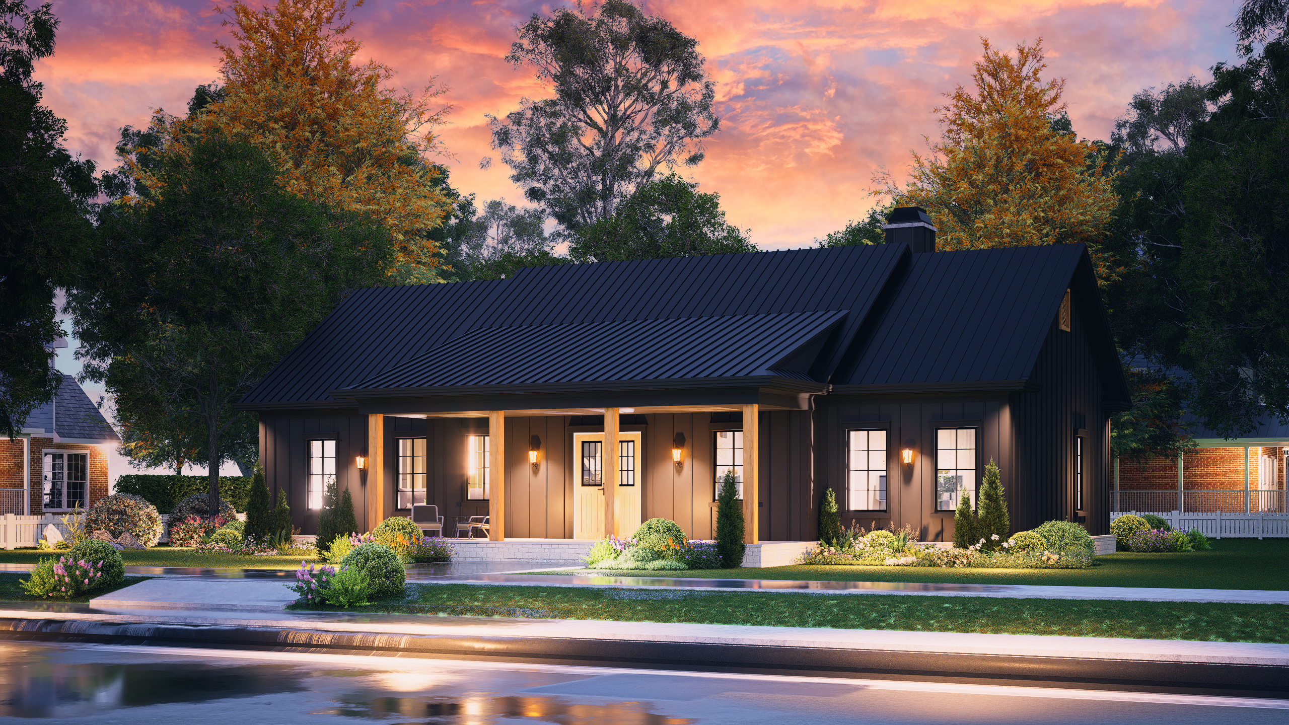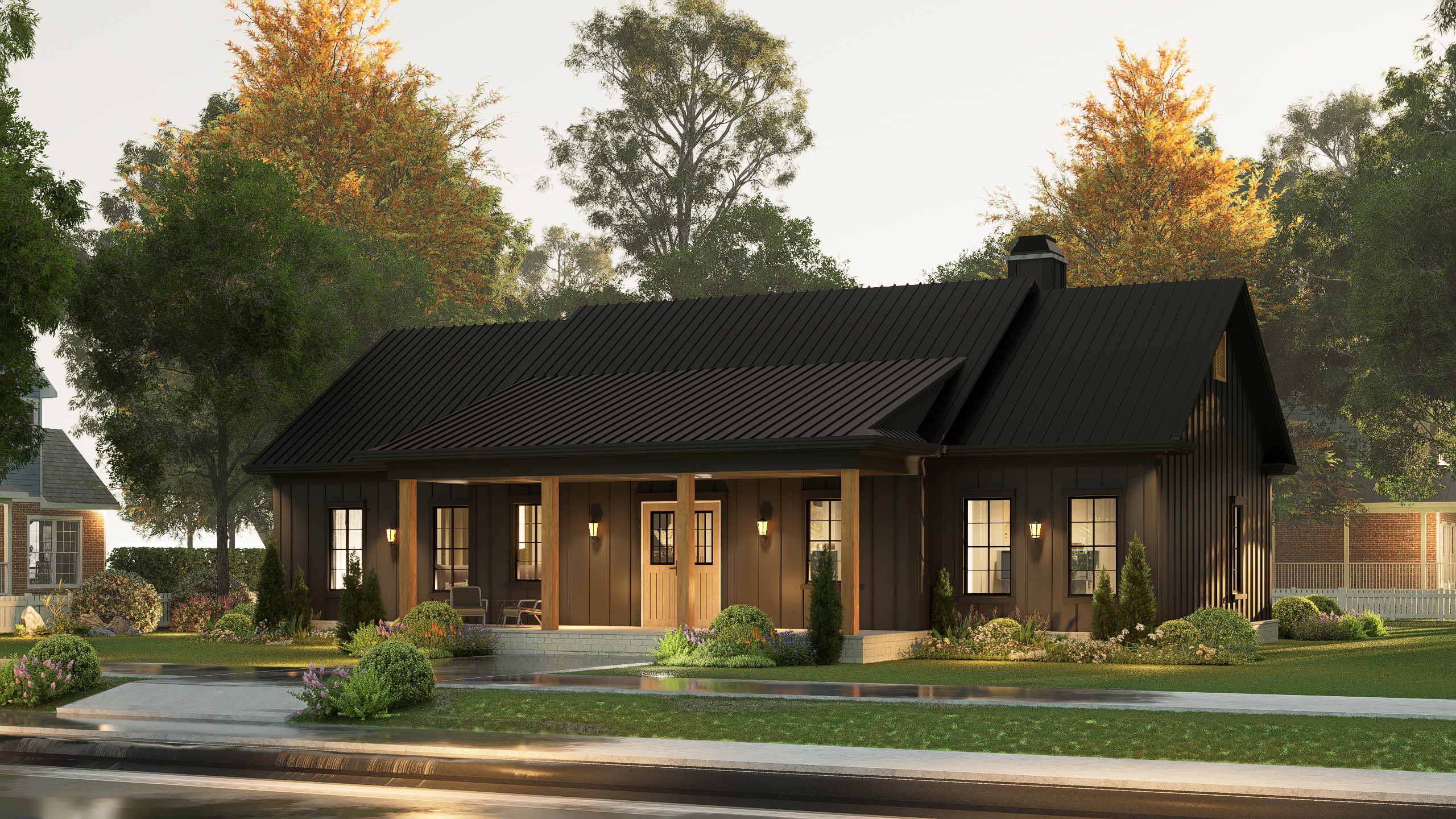 Ideal for entertaining or quiet evenings at home, this design features expansive outdoor spaces, including a welcoming 224-square-foot front porch, a 336-square-foot rear porch, and optional 288-square-foot rear decks for additional outdoor living. Crafted with 2x4 exterior wall framing, stick roof framing, and a versatile 8:12 roof pitch, this board-and-batten farmhouse combines rustic charm with modern convenience — perfect for families who love traditional design and open, airy living.