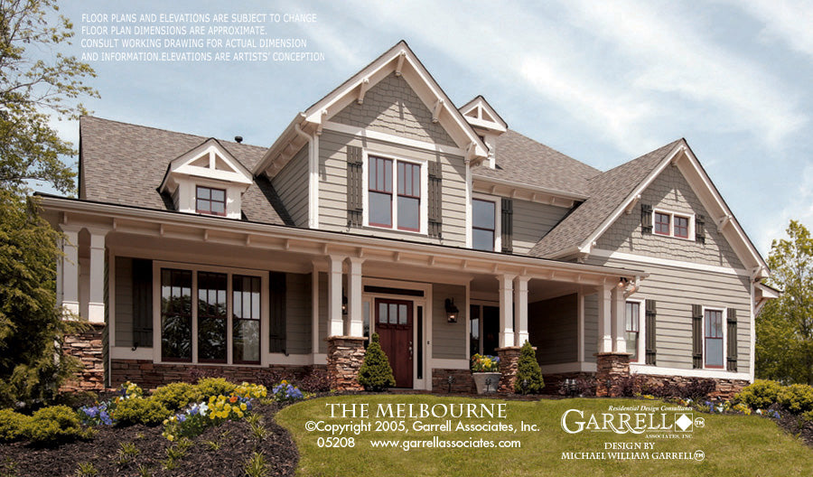 The Melbourne is a warm blend of shake and stacked stone. The rocking chair front porch, accented with twin columns give this Craftsman facade distinctive curb appeal. The Melbourne offers comfortable space with multiple living areas. An open floor plan gives a much larger feeling than the square footage suggests. The island kitchen opens to both the breakfast and angled keeping room. A beautiful stacked stone fireplace flanked by windows adds a warm centerpiece for family and friends. In traditional style, the two story foyer is flanked by a formal living room and dining room. Completing the first floor is a bedroom and full bath. On the second floor, the master bedroom, boasting a luxury bath and spacious walk in closet, is conveniently separated from two additional bedrooms by the hallway. The two bedrooms share a bathroom having a dual sink vanity and private tub and toilet room. We offer floor plan modifications on all of our master up house plan designs. Have a question about any of our house plans, call us at (888) 814 1494.