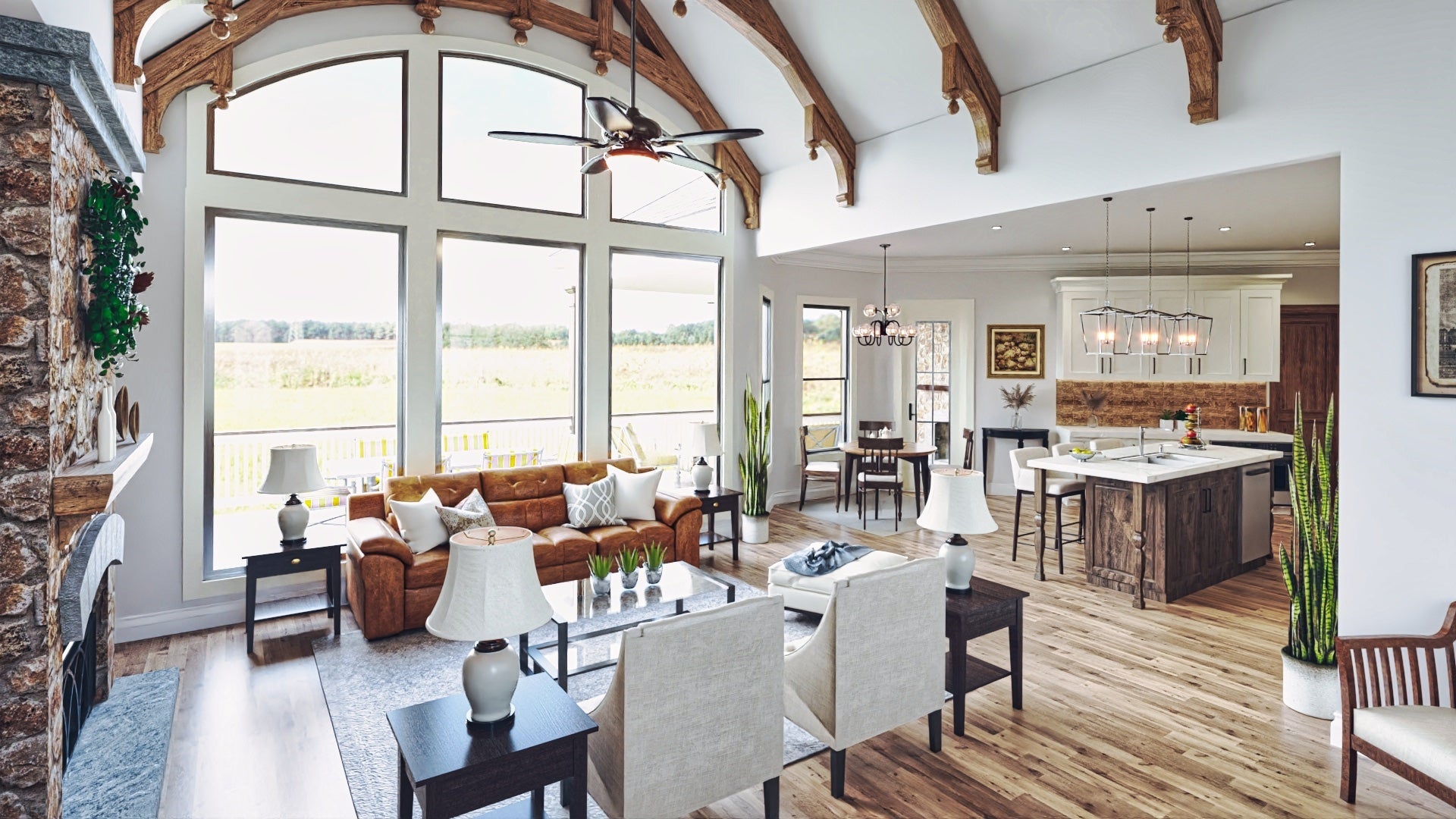 A charming and rustic ranch house plan with a cozy and inviting atmosphere. The exterior of the home features a combination of stone and wood siding with a metal roof, giving it a timeless and natural look. The interior boasts an open floor plan with a vaulted ceiling and exposed beams in the great room, a gourmet kitchen with a large island, and a spacious dining area that opens onto a covered porch. The master suite, located on the main level, features a luxurious bath with a spa tub and a walk-in closet. The plan has two additional bedrooms provide plenty of space for family and guests. With its warm and rustic charm, the Mill Spring Cottage B is the perfect retreat for those looking for a cozy and comfortable home.