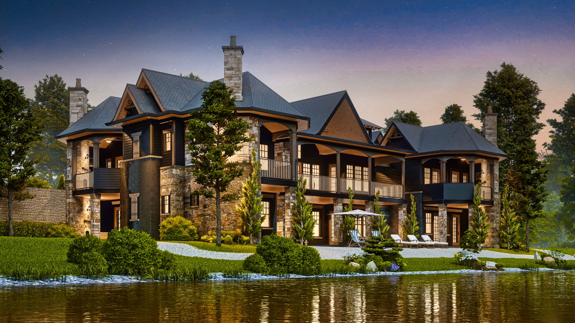 A unique mountain retreat floor plan for couples. Central social areas are flanked by truly private master suites, each complete with its own sleeping porch. Over-sized rear covered porch is ideal for entertaining and features a cozy built-in fireplace. This plan is a larger version of #07448, featuring two additional bedrooms on each level. We offer floor plan modifications on all of our rustic mountain style house plans.