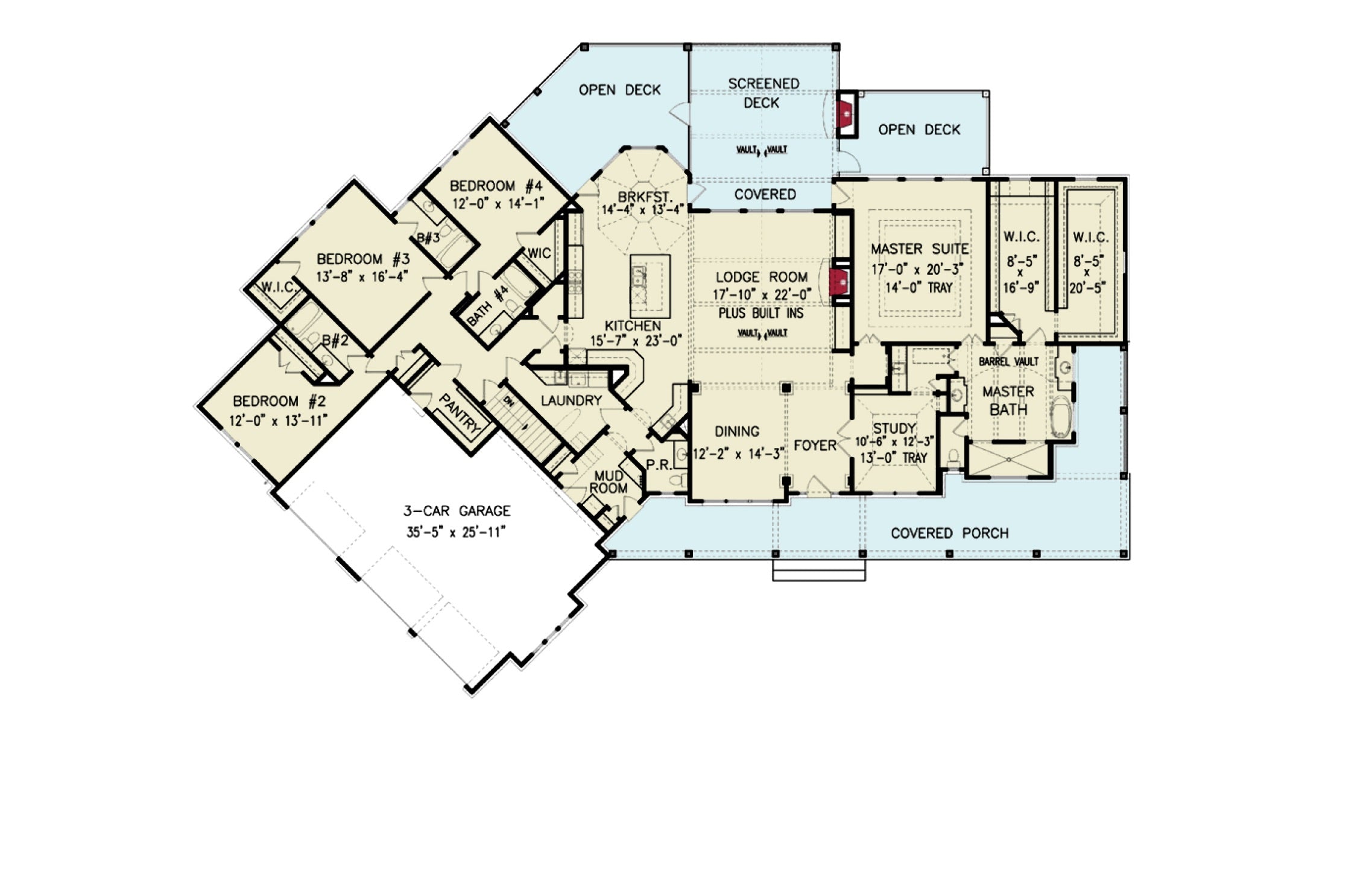 Luxurios craftsman style house with 4 beds, 4 baths and 3-car garage. A vaulted foyer welcomes you to a spacious lodge room, formal dining room and study room. The kitchen has access to breakfast room, open deck and screened deck. Master suite has walk in closet, luxury bath and morning kitchen. 3 more bedrooms with baths each, laundy and mud room round out first floor. There is an terrace house plan floor available that features porch and garage slab. An adorable craftmans style house plan!
