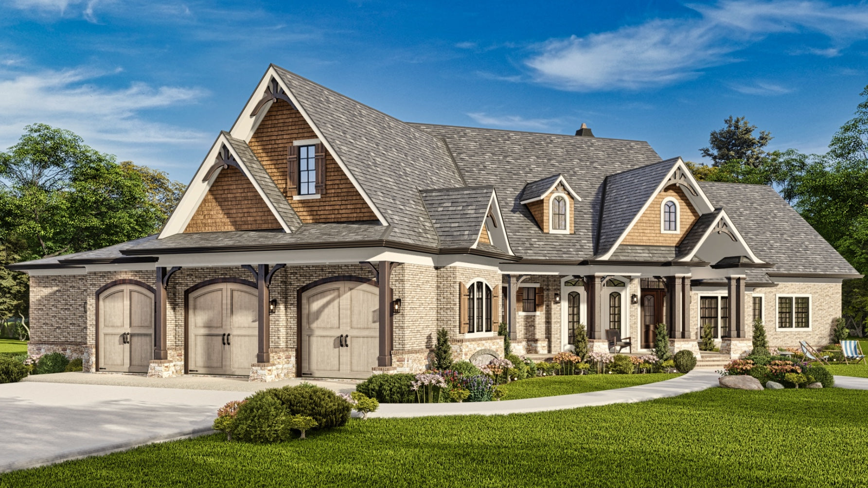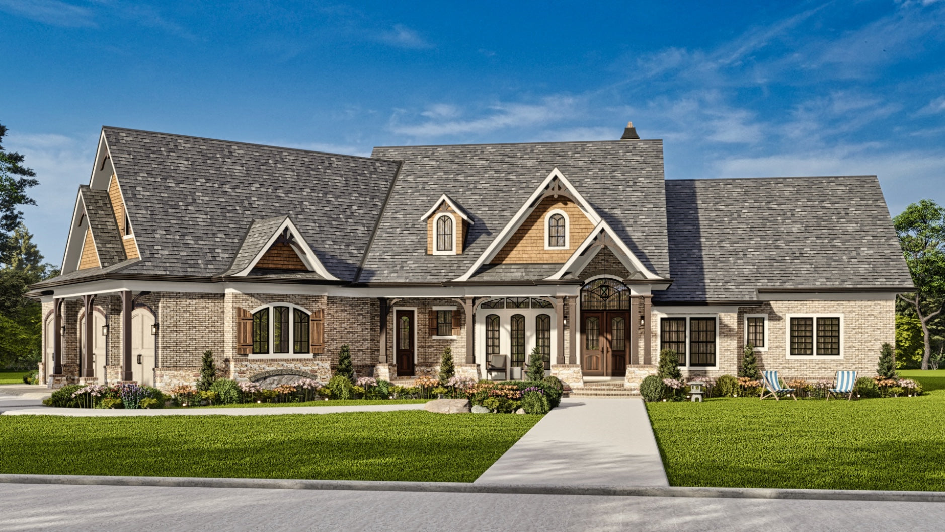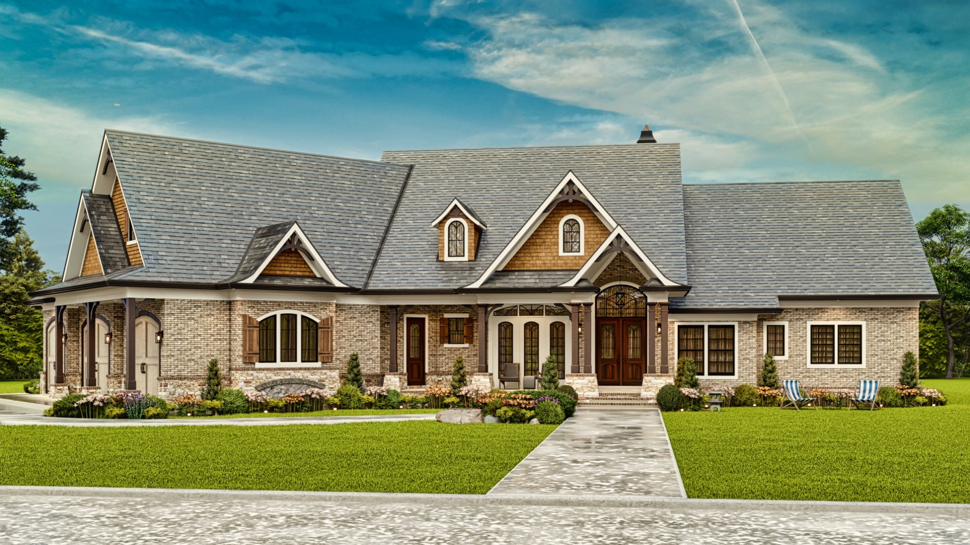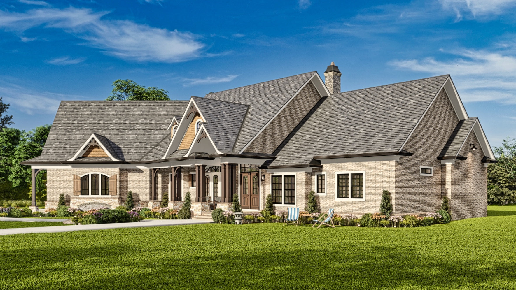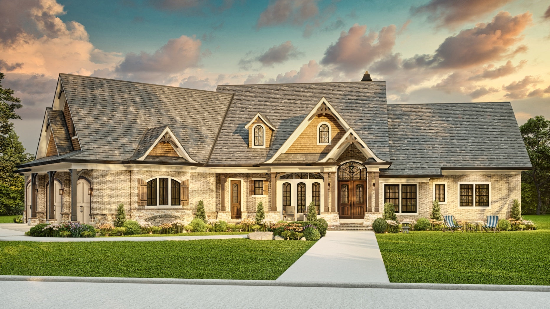 The Tranquility house is a stunning design that features a charming blend of contemporary and traditional architectural styles. The exterior of the plan is characterized by a welcoming front porch and classic gable roof, while the interior boasts an open floor plan that allows for seamless flow between living spaces. The plan includes 3 bedrooms, 3 bathrooms, and a 3-car garage. The main level includes a great room with a fireplace, a gourmet kitchen, a dining area, and a covered porch. Additionally, the Tranquility plan features large windows throughout, providing an abundance of natural light and stunning views of the surrounding landscape.