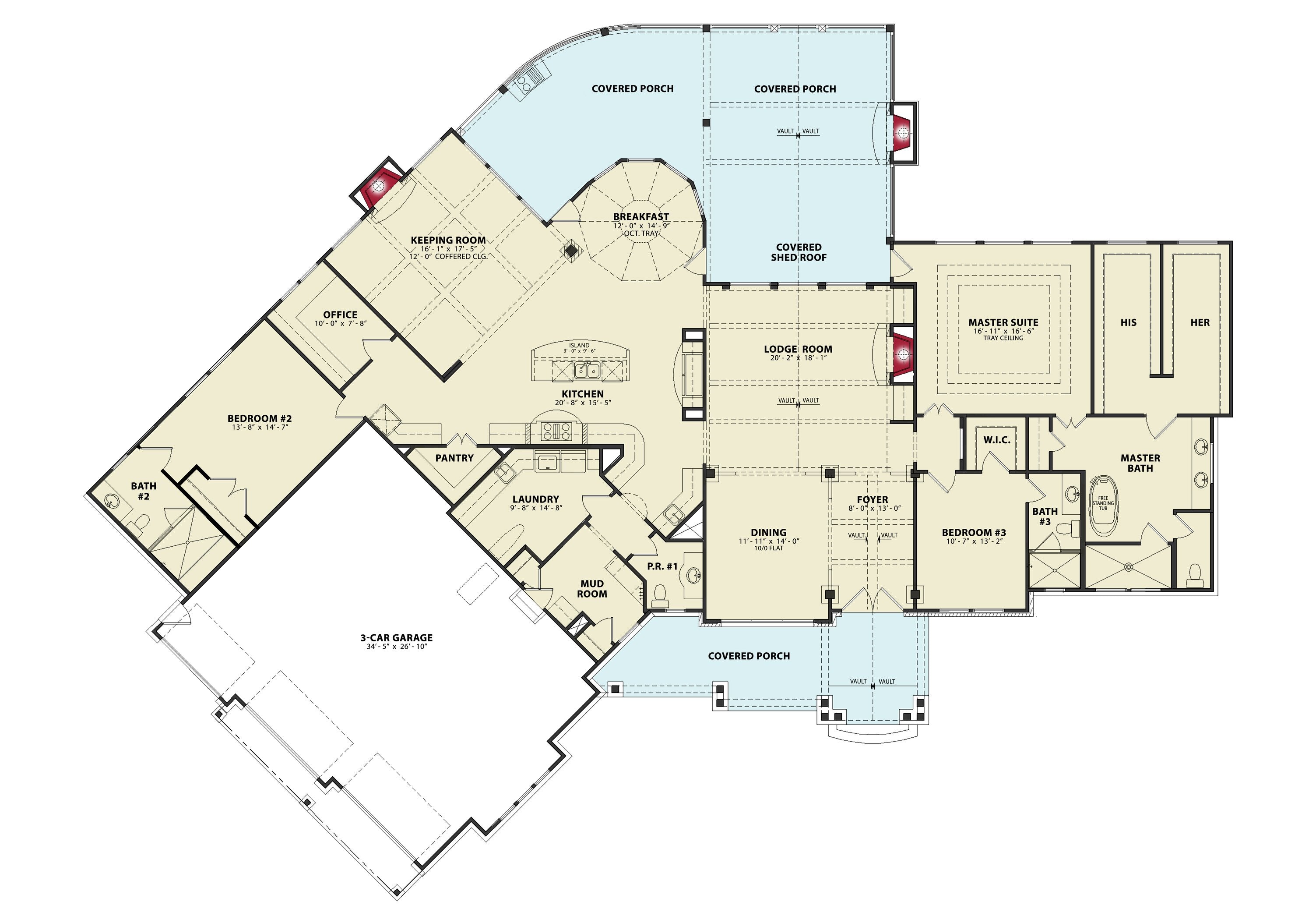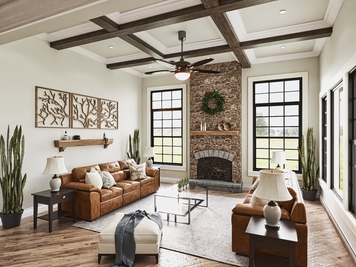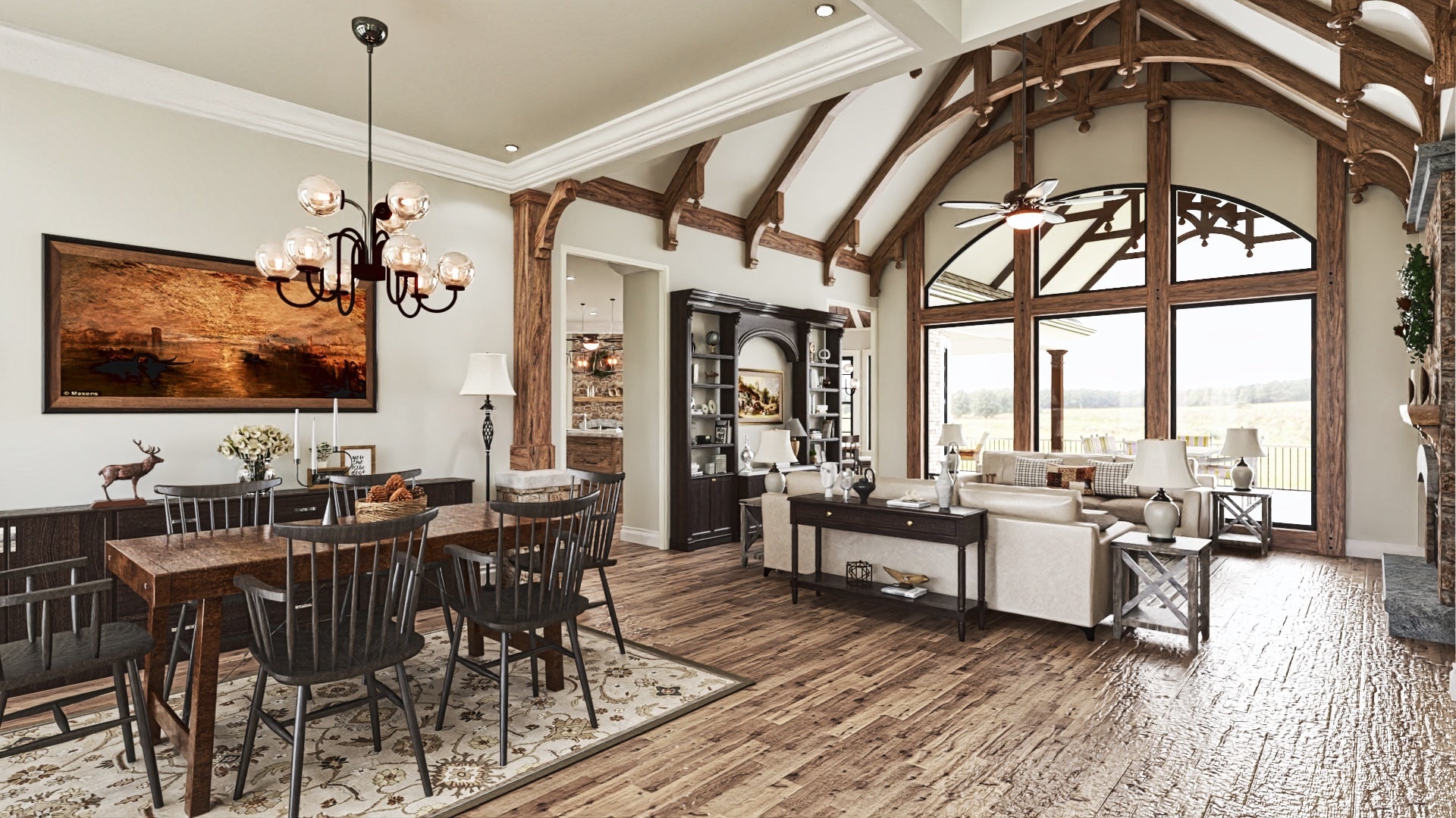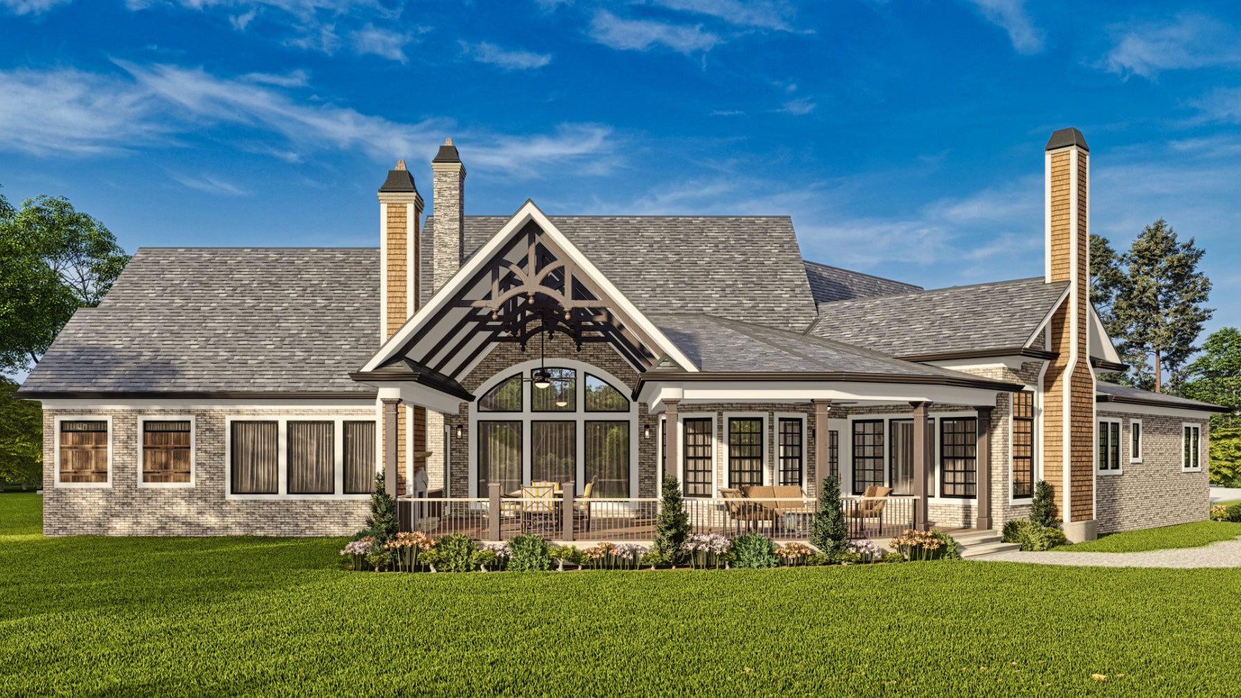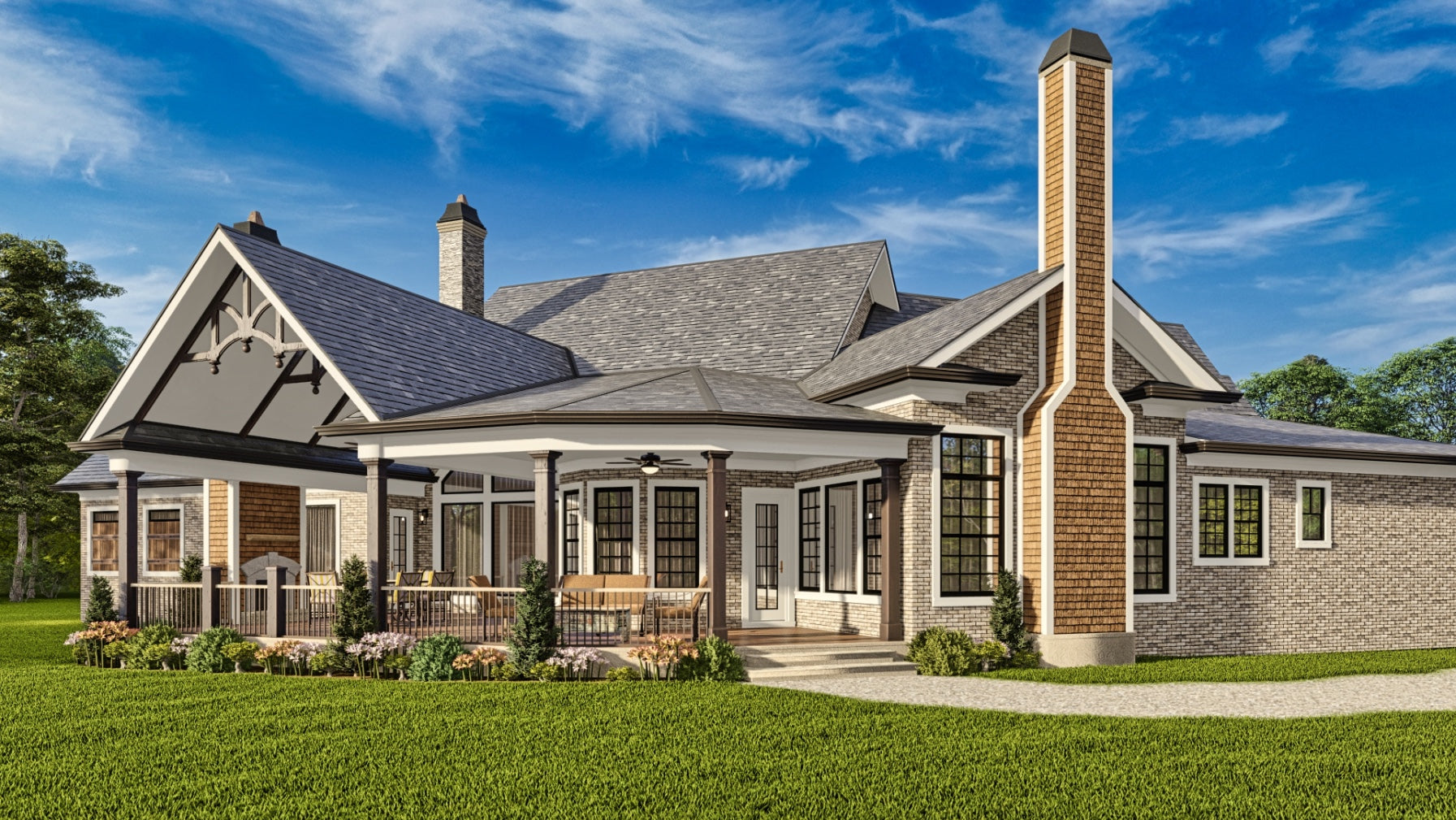 The Tranquility house is a stunning design that features a charming blend of contemporary and traditional architectural styles. The exterior of the plan is characterized by a welcoming front porch and classic gable roof, while the interior boasts an open floor plan that allows for seamless flow between living spaces. The plan includes 3 bedrooms, 3 bathrooms, and a 3-car garage. The main level includes a great room with a fireplace, a gourmet kitchen, a dining area, and a covered porch. Additionally, the Tranquility plan features large windows throughout, providing an abundance of natural light and stunning views of the surrounding landscape.