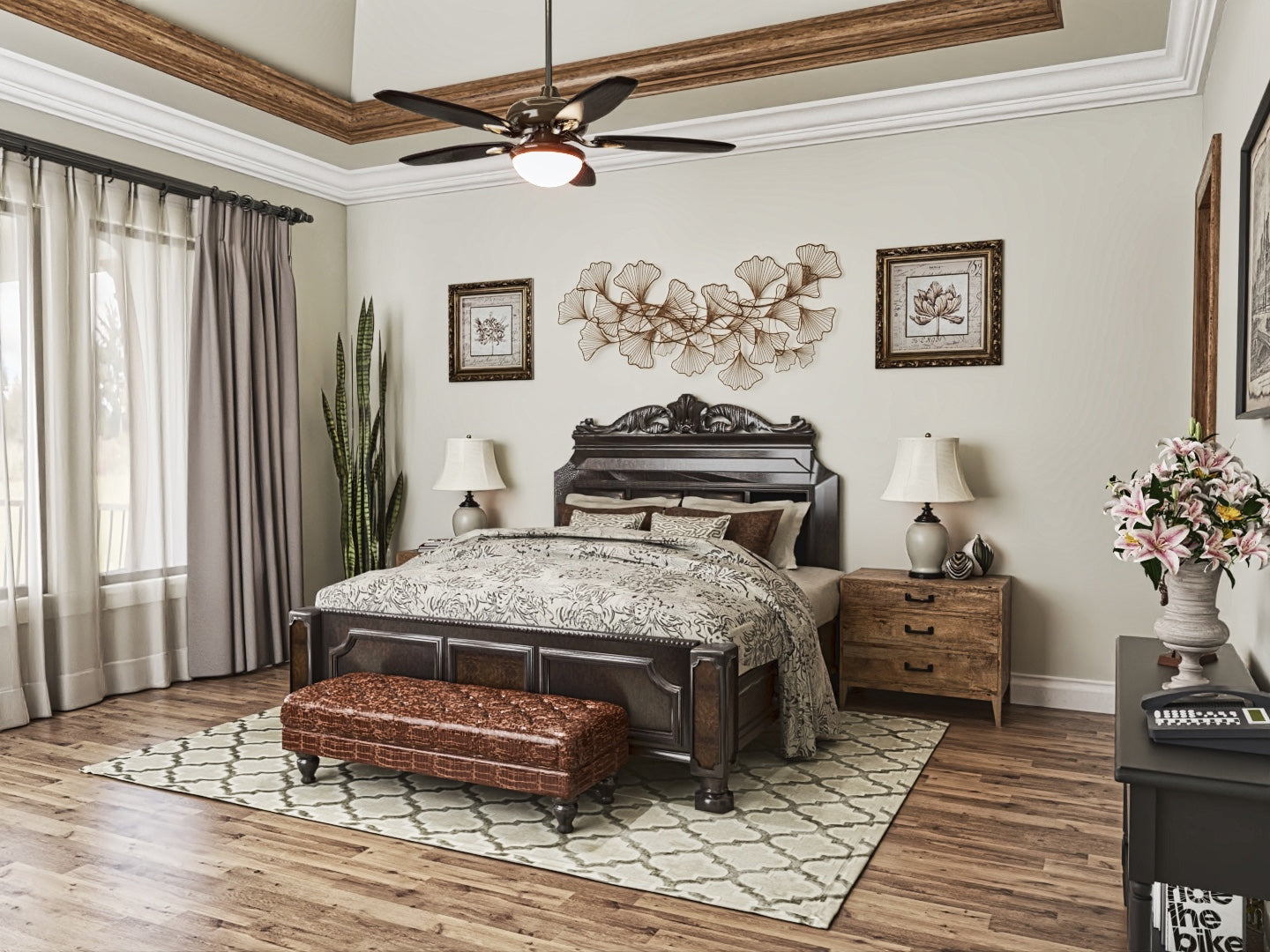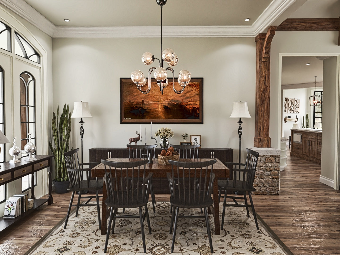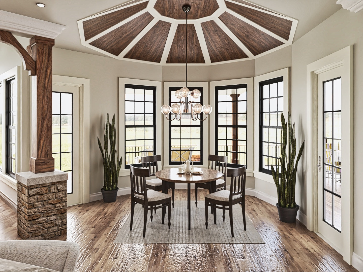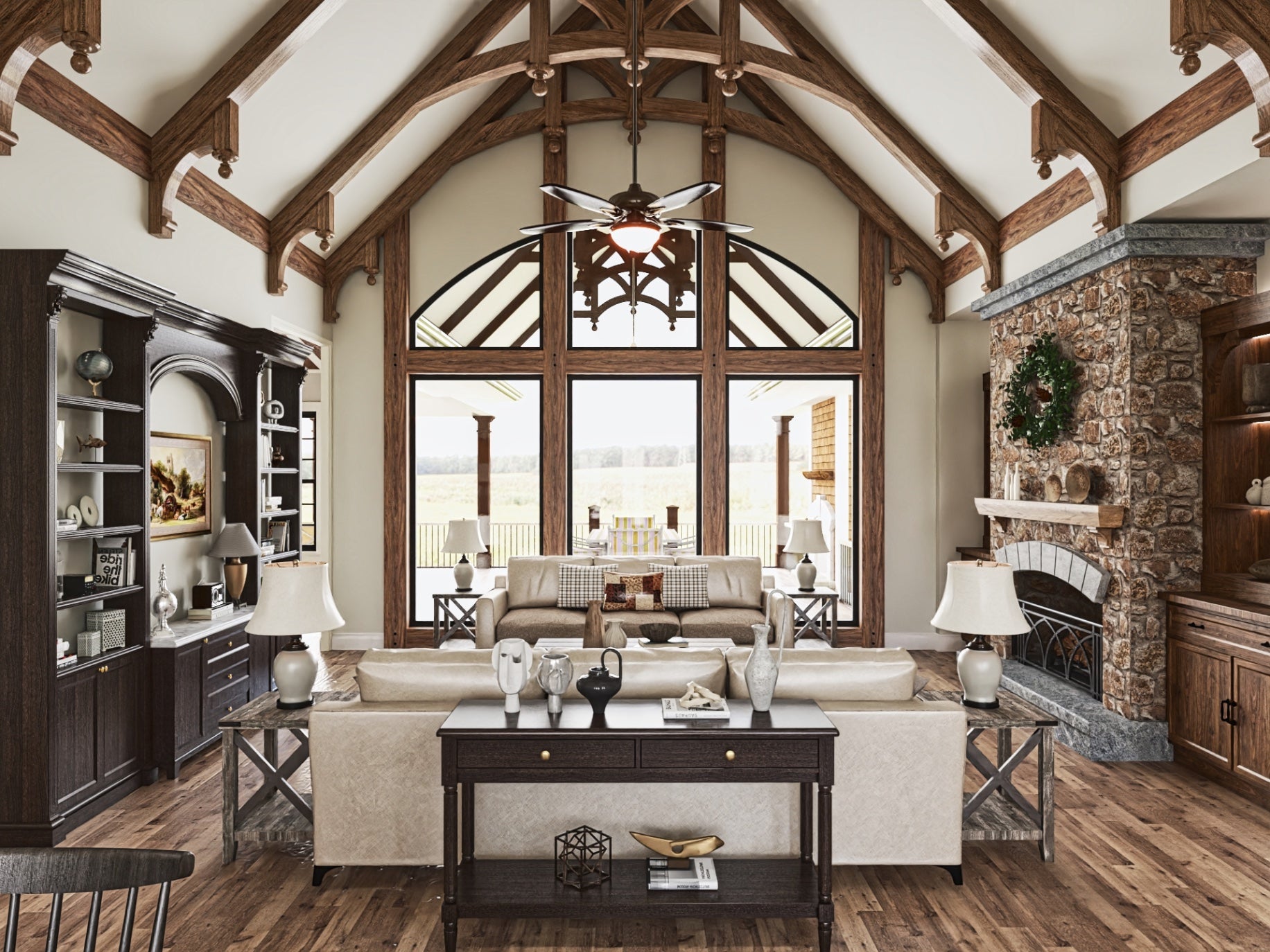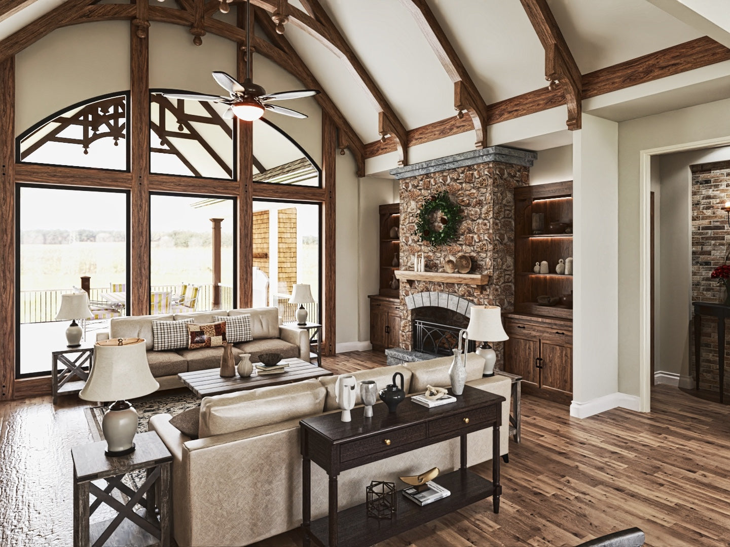 The Tranquility house is a stunning design that features a charming blend of contemporary and traditional architectural styles. The exterior of the plan is characterized by a welcoming front porch and classic gable roof, while the interior boasts an open floor plan that allows for seamless flow between living spaces. The plan includes 3 bedrooms, 3 bathrooms, and a 3-car garage. The main level includes a great room with a fireplace, a gourmet kitchen, a dining area, and a covered porch. Additionally, the Tranquility plan features large windows throughout, providing an abundance of natural light and stunning views of the surrounding landscape.
